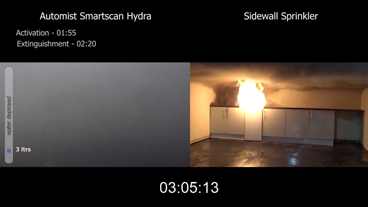 Plumis’ system uses smoke and heat sensing in tandem to identify and target the origin of a fire. The spray head located closest to the fire is then activated, enabling the pump to drive the mains water through the unique wall-mounted nozzle unit, targeting the fire directly with watermist – removing heat and displacing oxygen from the fire zone, resulting in fire control, suppression or extinguishment.